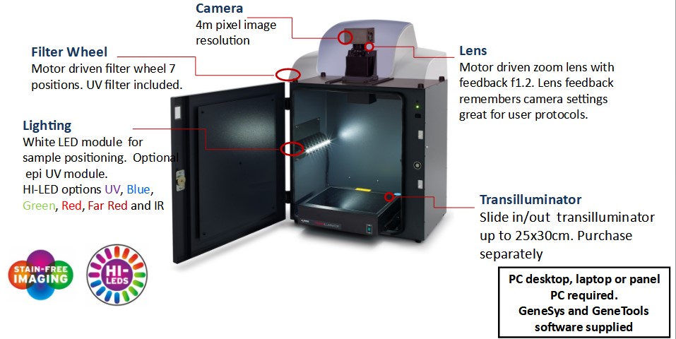 It contains a vast database of colorants and image protocols. All you need to know is the type of gel you use and GeneSys automatically selects the éclairage and the optimal filters to produce the parfaite image.