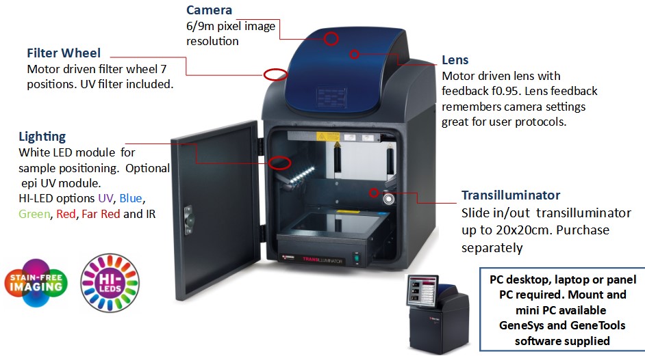 Contient une vaste base de données de colorants et de protocoles d'imagerie. Il vous suffit de connaître le type de gel que vous utilisez et GeneSys sélectionne automatiquement l'éclairage et les filtres optimaux pour produire l'image parfaite.