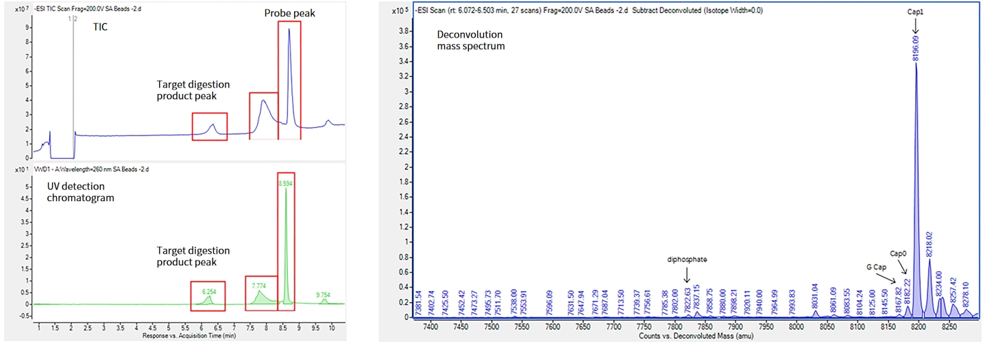 UV chromatogram and TIC total ion flow diagram showed that the purified samples treated by this kit had no impurity and no interference near the target peak, and the signal value of enzyme digestion products was strong, and the ratio of Cap1 and Cap0 could be obtained by deconvolution, respectively.