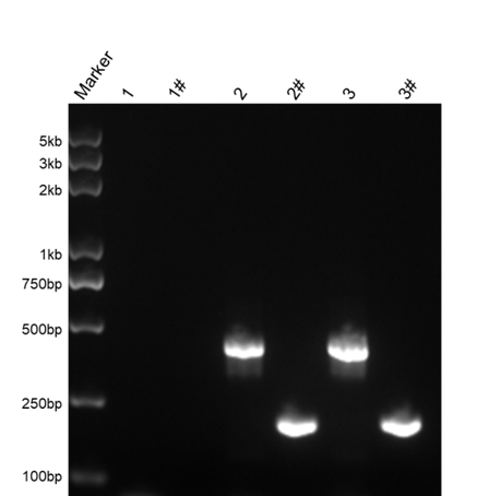 1, 2, 3 are 1st PCR products; 1#, 2#, 3# are the 2nd PCR products. The templates for each lane are: 1 and 1#, negative cell supernatant; 2 and 2#, mycoplasma contaminated cell supernatant; 3 and 3#, Positive Control.