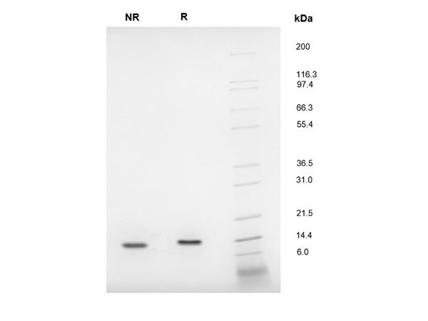 Figure 1. rh IL-4 (1μg) was resolved with SDS-PAGE under non-reducing (NR) and reducing (R) conditions and visualized by InstantBlue staining showing a single prominent band at 14.4 kDa.*