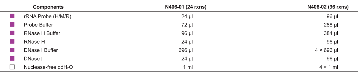 Ribo-off rRNA Depletion Kit (Human/Mouse/Rat) is designed for removing ribosomal RNA (rRNA) (including cytoplasmic 28S, 18S, 5.8S, 5S rRNA, and mitochondrial 16S, 12S rRNA) from total RNA of humans, mice, and rats while retaining mRNA and other non-coding RNA. The kit is applicable to both intact and partially degraded RNA samples (e.g. FFPE RNA), and the resulting ribosomal-depleted RNA can be used for the analysis of mRNA and non-coding RNA (such as lncRNA).