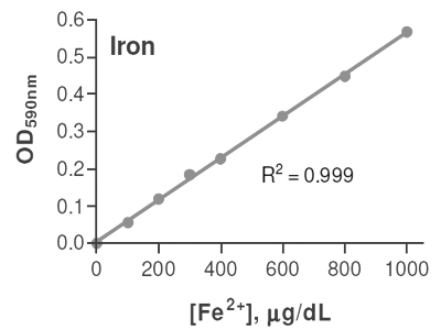 Iron Assay Kit is a quantitative colorimetric iron determination at 590 nm.This kit is designed to measure total iron directly in serum without any pretreatment. The improved method utilizes a chromogen that forms a blue colored complex specifically with Fe2+. Fe3+ in the sample is reduced to Fe2+, thus allowing the assay for total iron concentration. The intensity of the color, measured at 590 nm, is directly proportional to the iron concentration in the sample.