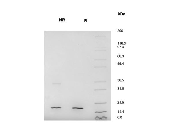 Figure 1. rh TNF-α (1μg) was resolved with SDS-PAGE under non-reducing (NR) and reducing (R) conditions and visualized by Instant Blue staining showing a single prominent band at 17.5kDa (+)