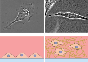 Le collagène est le composant principal du tissu conjonctif et est abondant dans le corps des mammifères. Il est largement utilisé dans la culture cellulaire 3D pour modéliser la matrice extracellulaire biologique, ou comme revêtement pour favoriser l'attachement cellulaire. De nombreuses cellules se développent naturellement dans un environnement tridimensionnel. Lorsqu'elles sont cultivées in vitro , les cellules sont attachées à une surface 2D plate et peuvent se comporter différemment que lorsqu'elles sont à l'intérieur d'une matrice de gel 3D. Dans de nombreux cas, un environnement 3D ressemble plus à une situation in vivo , qui doit être prise en compte lors de la planification des essais de culture cellulaire. |