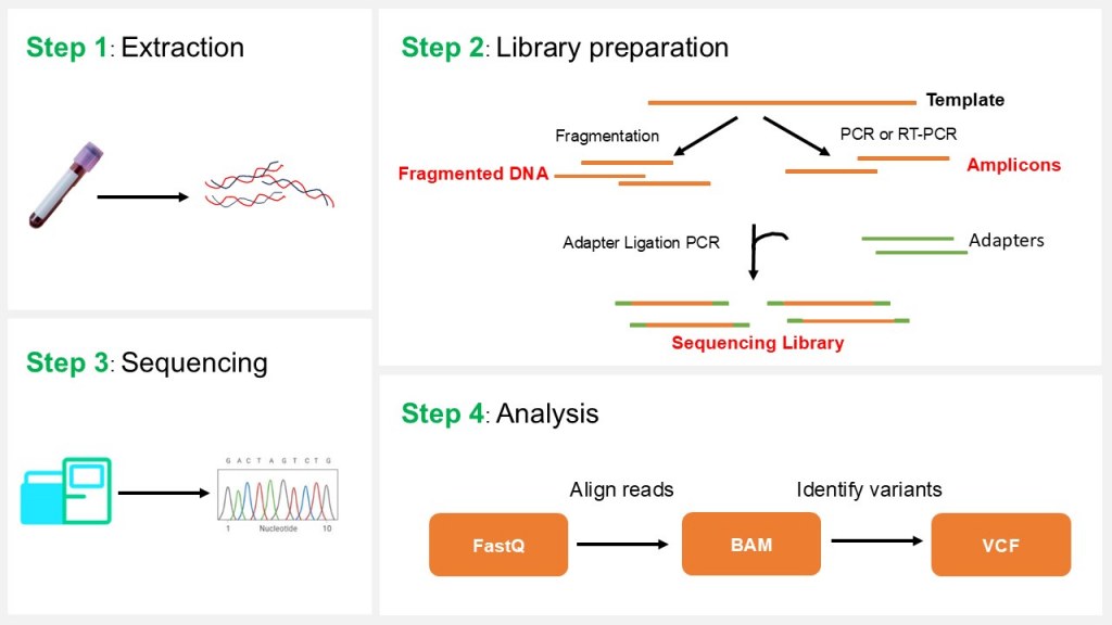 Le NGS implique quatre étapes principales : extraction des échantillons, préparation des banques, séquençage et analyse des données (Figure 1).